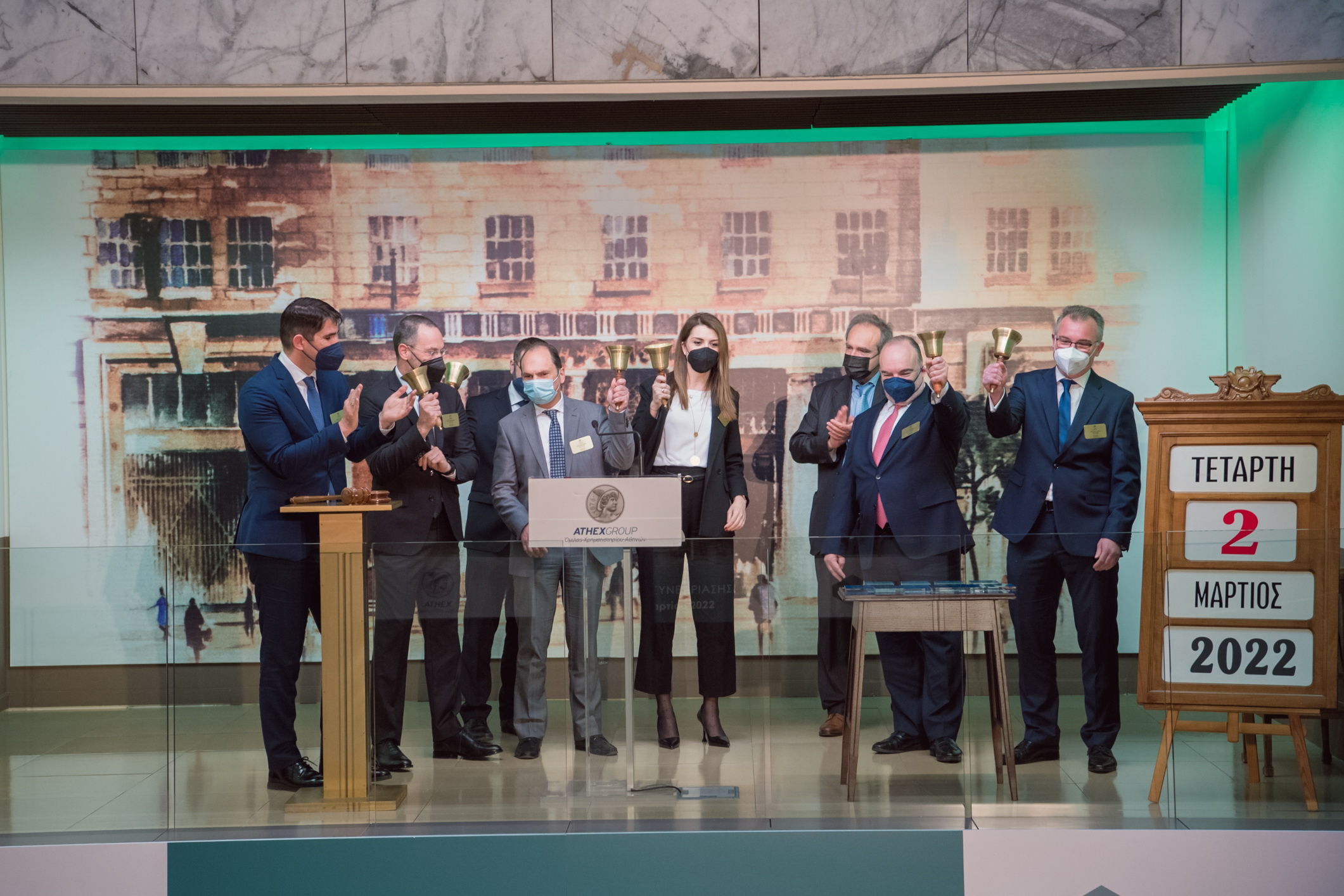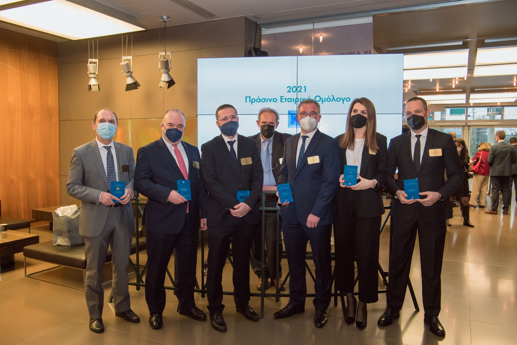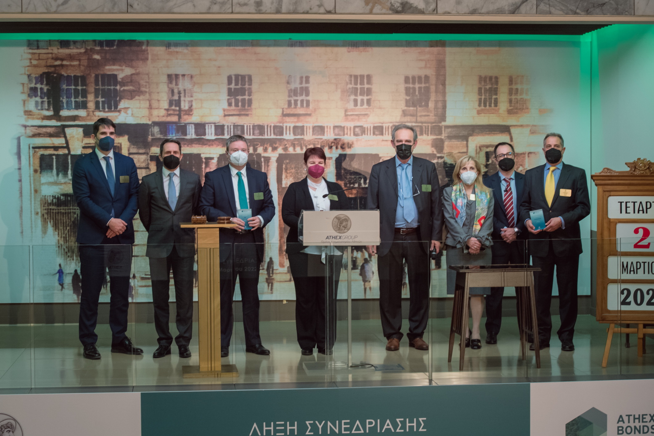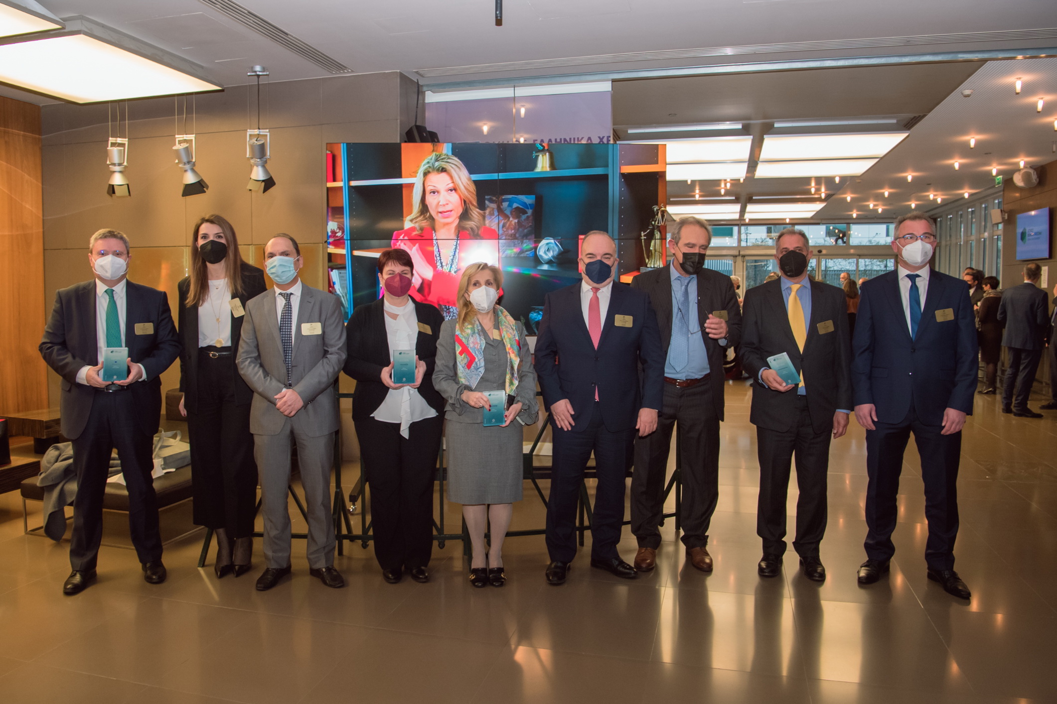 Τιμητικές πλακέτες για την έκδοση ESG ομολόγων παρέλαβαν οι κ.κ. Πηνελόπη Λαζαρίδου, Γενική Διευθύντρια Χρηματοοικονομικών Υπηρεσιών-Εκτελεστικό Μέλος Διοικητικού Συμβουλίου ΓΕΚ ΤΕΡΝΑ, Τερέζα Μεσσάρη, CFO/COO Prodea Investments, Εμμανουήλ Φαφαλιός, CFO Operations Tέρνα Ενεργειακή ΑΒΕΤΕ και Παναγιώτης Καπετανάκος, CEO Noval Property.