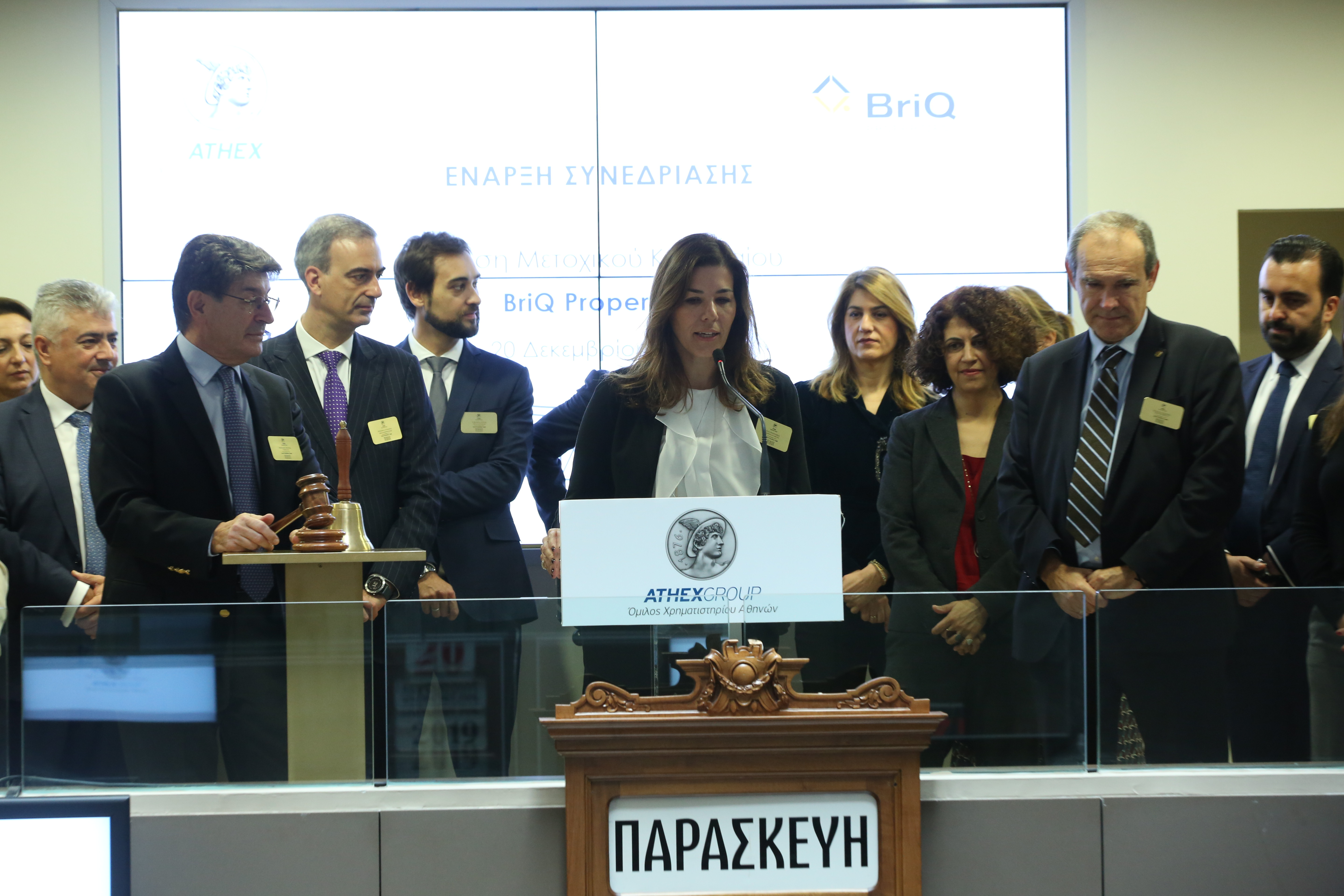 Το παραδοσιακό καμπανάκι έναρξης της συνεδρίασης του Χρηματιστηρίου Αθηνών χτύπησαν ο κ.  Θεόδωρος Φέσσας Πρόεδρος της BriQ Properties και η κα. ΄Αννα Αποστολίδου, Διευθύνουσα Σύμβουλος της εταιρείας.