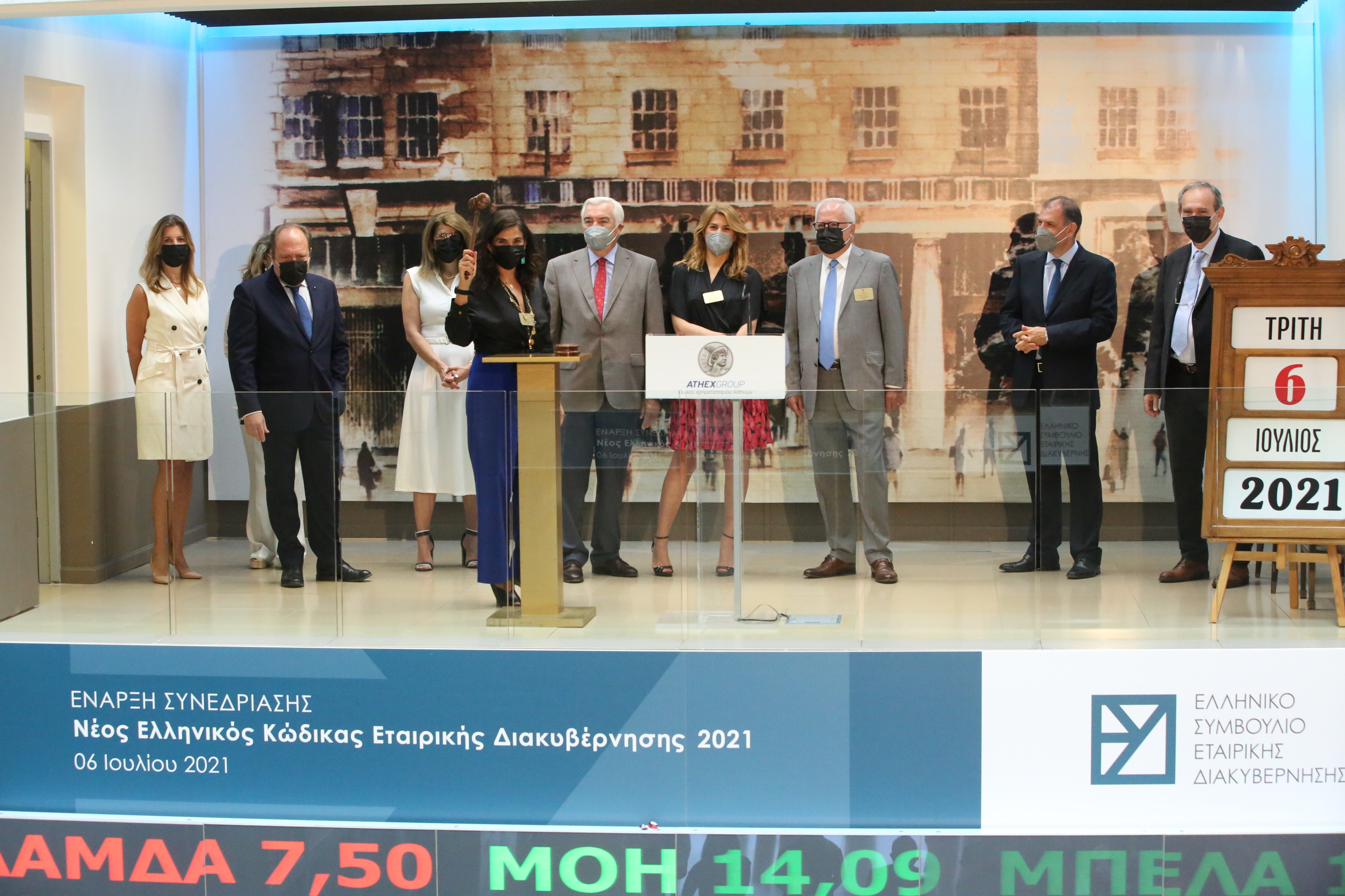 Με αφορμή την έκδοση του Αναθεωρημένου Ελληνικού Κώδικα Εταιρικής Διακυβέρνησης 2021 από το ΕΣΕΔ, Ο Διευθύνων Σύμβουλος του Ομίλου Χρηματιστηρίου Αθηνών Σωκράτης Λαζαρίδης υποδέχτηκε τα Μέλη του Συμβουλίου Διοίκησης και του 15μελούς Συμβουλίου Εταιρικής Διακυβέρνησης του ΕΣΕΔ. Η Αντιπρόεδρος του ΕΣΕΔ κα. Ξένια Καζόλη εν απουσία του κου. George Serafeim, Προέδρου του ΕΣΕΔ , χτύπησε το παραδοσιακό καμπανάκι έναρξης της συνεδρίασης της 6ης Ιουλίου 2021.