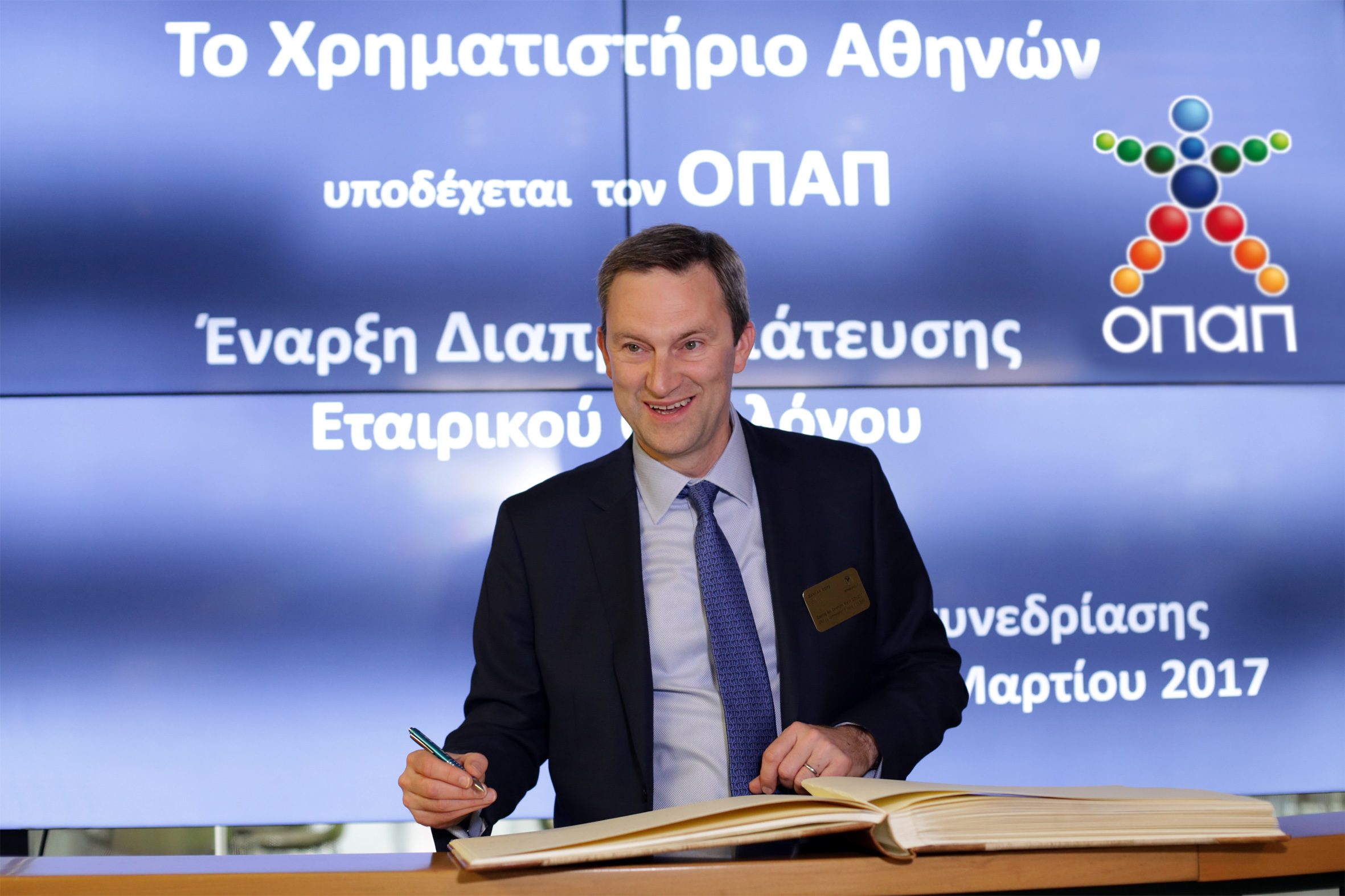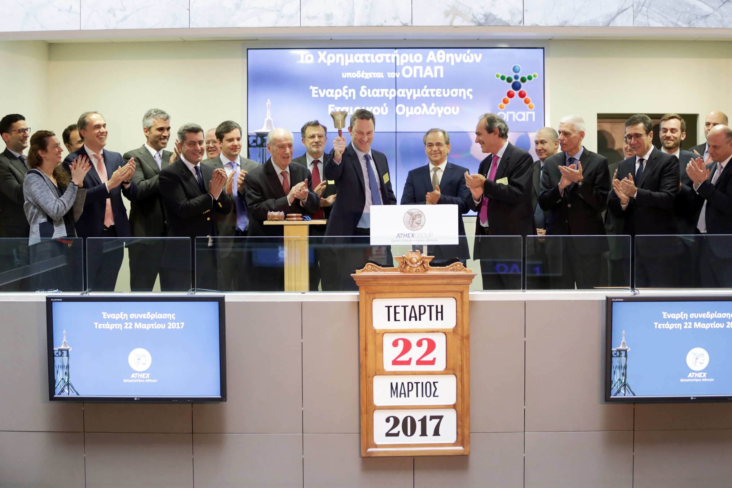 Το Χρηματιστήριο Αθηνών υποδέχτηκε τον Οργανισμό Προγνωστικών Αγώνων Ποδοσφαίρου - ΟΠΑΠ, στην τελετή Έναρξης της συνεδρίασης του Χρηματιστηρίου την Τετάρτη 22 Μαρτίου 2017, με την ευκαιρία της εισαγωγής προς διαπραγμάτευση στην Οργανωμένη Αγορά του Χρηματιστηρίου Αθηνών, του Εταιρικού του Ομολόγου.