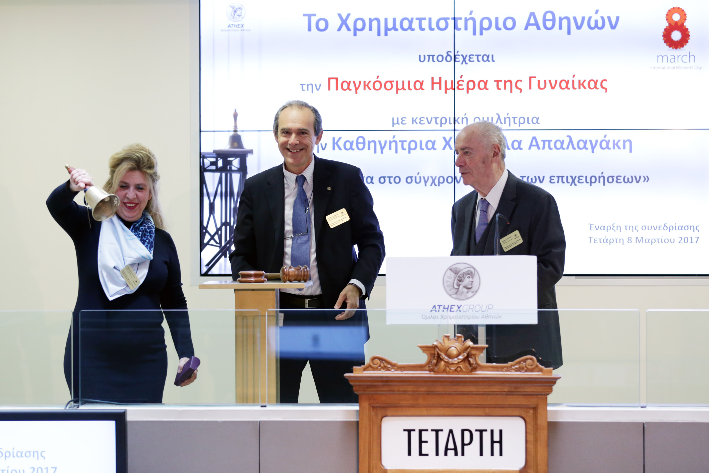 Η καθηγήτρια κα Απαλαγάκη κηρύττοντας την Έναρξη της συνεδρίασης δήλωσε: «εκ μέρους όλων των γυναικών που συμμετέχουν στην οικονομική εξέλιξη της χώρας θα ήθελα να ευχαριστήσω για την τιμητική πρόσκληση και να ευχηθώ το Χρηματιστήριο Αθηνών, που διατήρησε ισχυρές τις ελπίδες ακόμα και στα χρόνια της κρίσης, να μπορεί του χρόνου τέτοια μέρα να έχει καταγράψει σημαντικές επιτυχίες και να γιορτάζει σημαντική άνοδο της οικονομίας, του τραπεζικού κλάδου και του συνόλου της οικονομίας».