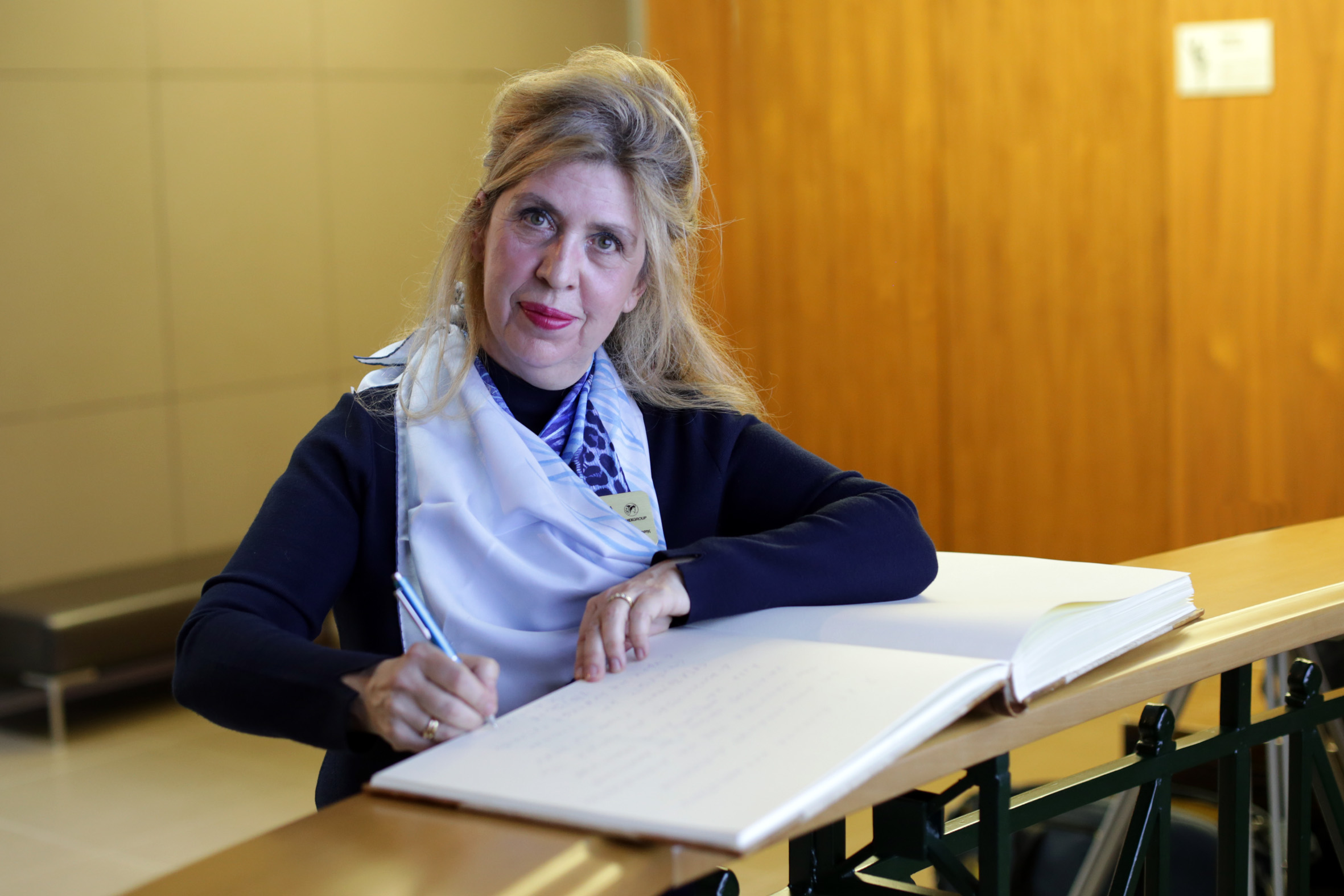 Η κ. Χαρούλα Απαλαγάκη υπογράφει στο βιβλίο επισκεπτών |
