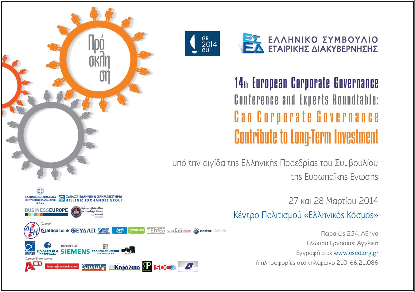 14th European Corporate Governance Conference and Experts Roundtable: "How can Corporate Governance Contribute to Long-Term Investment" Το Συνέδριο διοργανώθηκε από το Ελληνικό Συμβούλιο Εταιρικής Διακυβέρνησης, υπό την αιγίδα της Ελληνικής Προεδρίας του Συμβουλίου της Ευρωπαϊκής Ένωσης, σε συνεργασία με την Ελληνική Επιτροπή Κεφαλαιαγοράς και την υποστήριξη του Ομίλου Ελληνικά Χρηματιστήρια στο Κέντρο Πολιτισμού "Ελληνικός Κόσμος" στις 27 και 28 Μαρτίου 2014. (Δελτίο Τύπου) (Πρόγραμμα) |