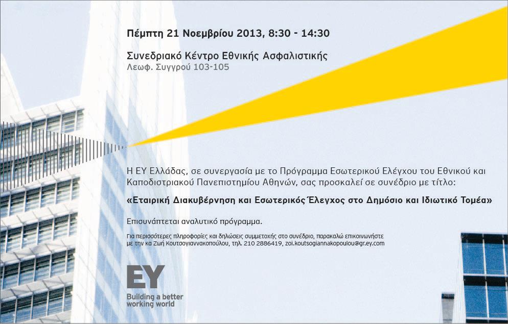 | 21/11/2013 | Εκδήλωση: "Εταιρική Διακυβέρνηση και Εσωτερικός Έλεγχος στο Δημόσιο και στον Ιδιωτικό Τομέα", (Πρόγραμμα), της ΕΥ Ελλάδας, σε συνεργασία με το Πρόγραμμα Εσωτερικού Ελέγχου του Εθνικού και Καποδιστριακού Πανεπιστημίου Αθηνών.(παρουσίαση) | |