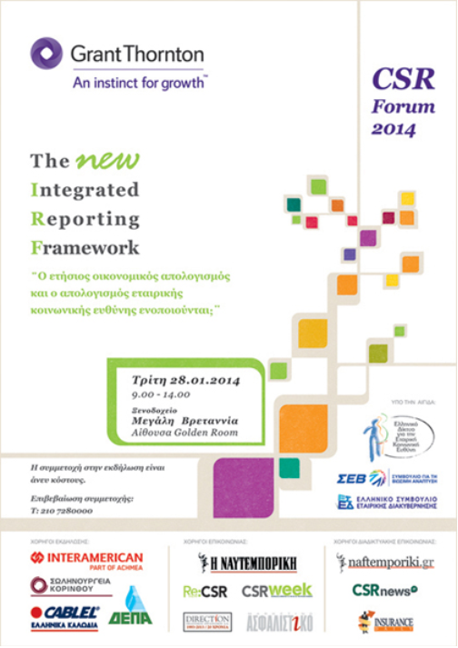 Συνέδριο CSR Forum 2014 της Grant Thornton κατά την διάρκεια του οποίου έγινε η επίσημη παρουσίαση του International Integrated Reporting Framework (IIRF) στην Ελλάδα. (παρουσίαση και λεπτομέρειες) Η εκδήλωση υποστηρίχθηκε από το Ελληνικό Συμβούλιο Εταιρικής Διακυβέρνησης, το Συμβούλιο του ΣΕΒ για τη Βιώσιμη Ανάπτυξη και το Ελληνικό Δίκτυο για την Εταιρική Κοινωνική Ευθύνη. |
