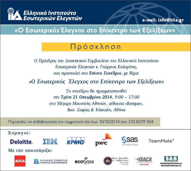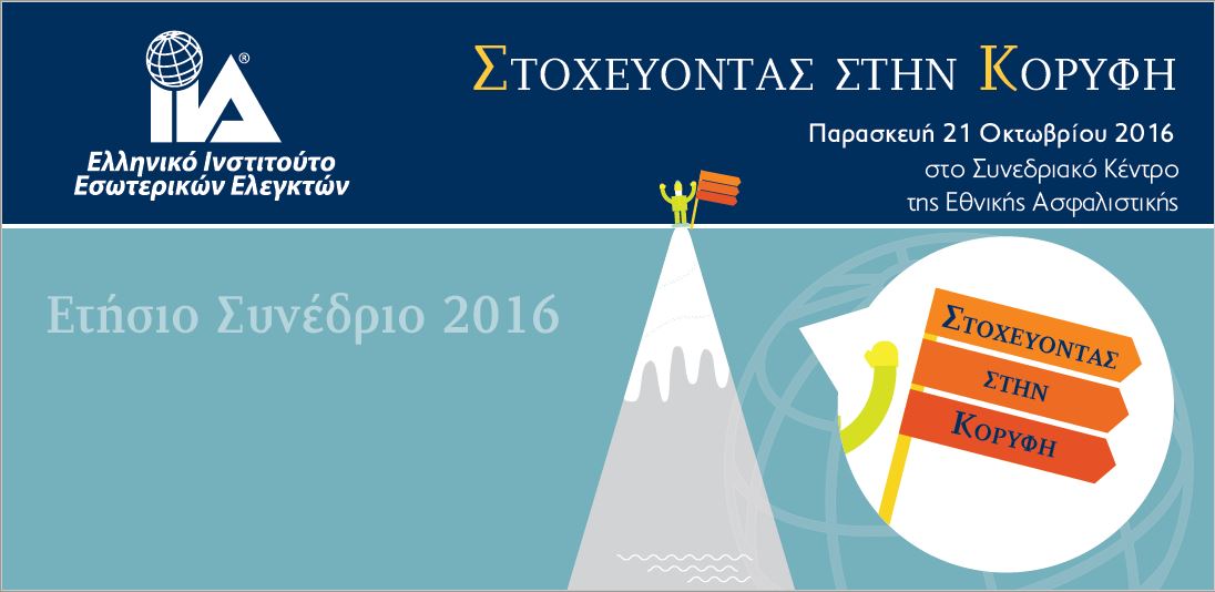 | 21/10/2016 | Tο Eλληνικό Ινστιτούτο Εσωτερικών Ελεγκτών (ΕΙΕΕ) διοργάνωσε το ετήσιο συνέδριό του με θέμα: «Στοχεύοντας στην κορυφή», υπό την αιγίδα του Ελληνικού Συμβουλίου Εταιρικής Διακυβέρνησης, την Παρασκευή 21 Οκτωβρίου 2016, στο Συνεδριακό Κέντρο της Εθνικής Ασφαλιστικής. Πρόγραμμα Ιστοσελίδα |