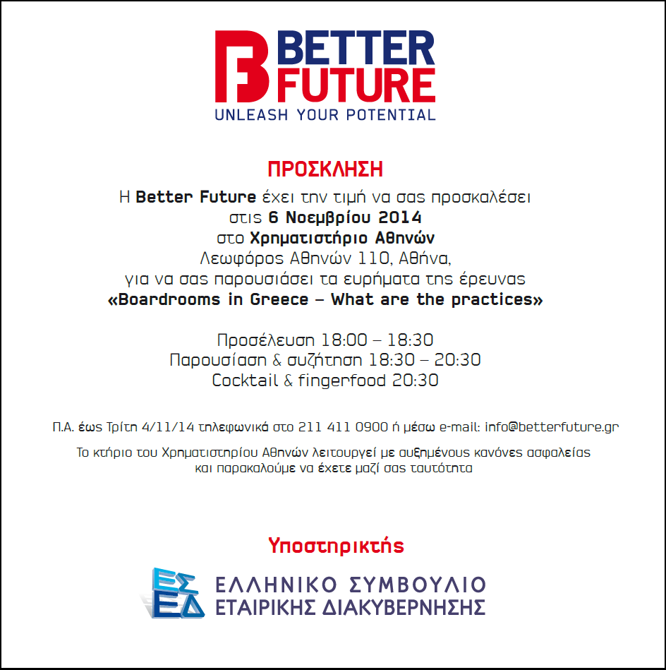 Εκδήλωση με θέμα «Boardrooms in Greece: What are the practices», διοργανώθηκε από την εταιρεία BETTER FUTURE με την υποστήριξη του ΕΣΕΔ στην αίθουσα ΕΡΜΗΣ του Χρηματιστηρίου Αθηνών. (Έρευνα) (Παρουσίαση - Λήδα Κοντογιάννη) (Παρουσίαση - Terry McNulty) |