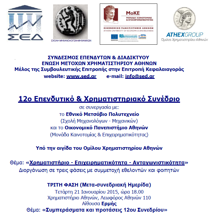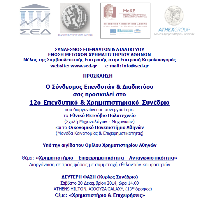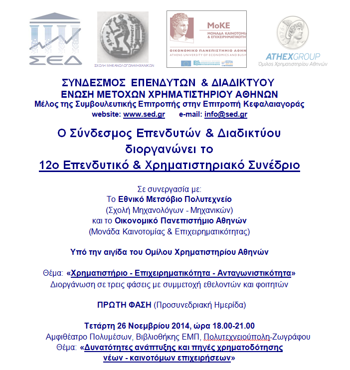 Ο Σύνδεσμος Επενδυτών & Διαδικτύου (ΣΕΔ) διοργάνωσε το 12ο Επενδυτικό & Χρηματιστηριακό Συνέδριο σε συνεργασία με το Εθνικό Μετσόβιο Πολυτεχνείο (Σχολή Μηχανολόγων - Μηχανικών) και το Οικονομικό Πανεπιστήμιο Αθηνών (Μονάδα Καινοτομίας & Επιχειρηματικότητας) υπό την αιγίδα του Ομίλου Χρηματιστηρίου Αθηνών με Θέμα «Χρηματιστήριο - Επιχειρηματικότητα - Ανταγωνιστικότητα». Το Συνέδριο διοργανώθηκε σε τρεις φάσεις με συμμετοχή εθελοντών και φοιτητών.