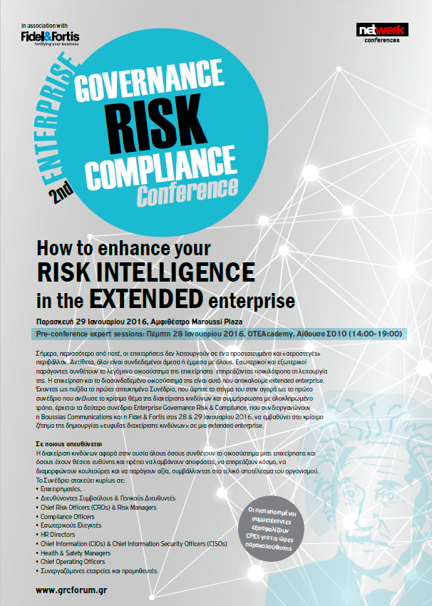 | 29/01/2016 | H Boussias Communication και η Fidel&Fortis συνδιοργάνωσαν το 2ο Συνέδριο Enterprise Governance Risk & Compliance στις 29 Ιανουαρίου 2016 στο Αμφιθέατρο Maroussi Plaza. Το εν λόγω συνέδριο τέθηκε και υπό την αιγίδα του ΕΣΕΔ. Στο Συνέδριο συμμετείχε με παρουσίαση η κυρία Λήδα Κοντογιάννη (Παρουσίαση - ΛΚ) (Ιστοσελίδα συνεδρίου) |