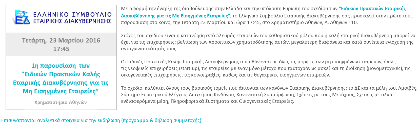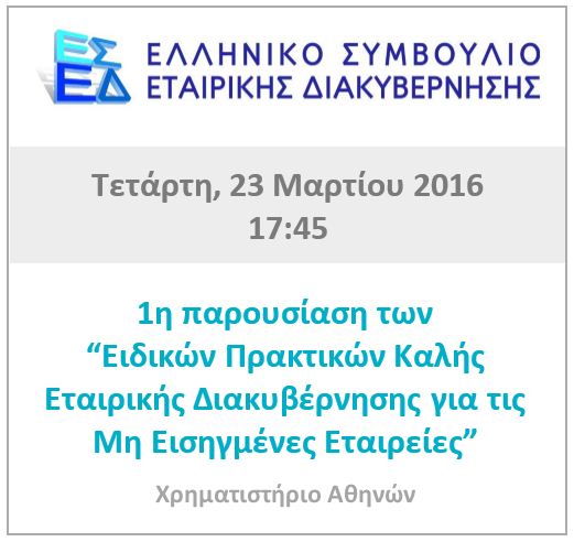Το Ελληνικό Συμβούλιο Εταιρικής Διακυβέρνησης διοργάνωσε εκδήλωση με θέμα την 1η παρουσίαση των "Ειδικών Πρακτικών Καλής Εταιρικής Διακυβέρνησης για τις Μη Εισηγμένες Εταιρείες" την Τετάρτη 23 Μαρτίου 2016 στο Χρηματιστήριο Αθηνών. (Δελτίο Τύπου) (Πρόγραμμα) (Παρουσίαση Σ.Ποταμίτη) (Ομιλία Σ. Κουνενάκη - Εφραίμογλου) (Ομιλία Β. Γκόβαρη) (Άρθρο ΝΑΥΤΕΜΠΟΡΙΚΗ) |