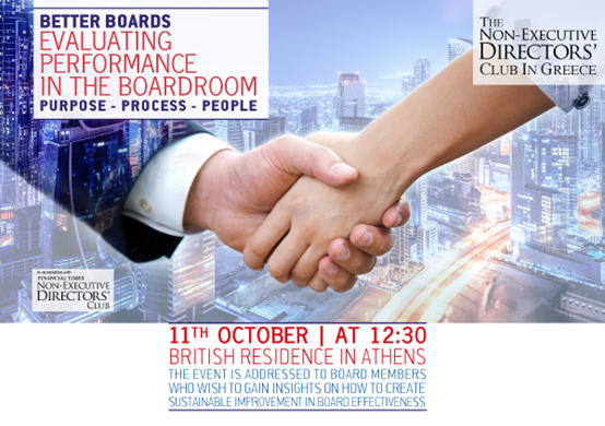 | 11/10/2016 | Tο Non-Executive Directors' Club in Greece (non-execs.gr) διοργάνωσε workshop με θέμα Better Boards - "Evaluating Performance in the Boardroom, Purpose - Process - People", υπό την αιγίδα του Ελληνικού Συμβουλίου Εταιρικής Διακυβέρνησης, σε συνεργασία με το Financial Times Non-Executive Directors Club (UK) την Τρίτη 11 Οκτωβρίου 2016. Πρόγραμμα |