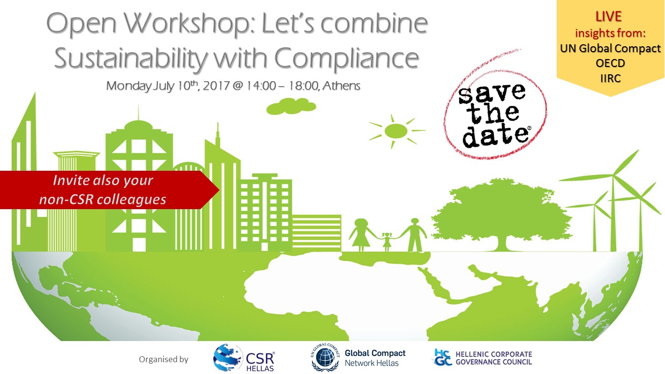 | 10/07/2017 | To CSR HELLAS σε συνεργασία με το ΕΣΕΔ διοργάνωσαν τη Δευτέρα, 10 Ιουλίου ειδικό εκπαιδευτικό και ενημερωτικό σεμινάριο, διάρκειας 4 ωρών, με θέμα "Let's combine sustainability with compliance" στο κτήριο του ΕΒΕΑ. Πρόγραμμα Ιστοσελίδα |