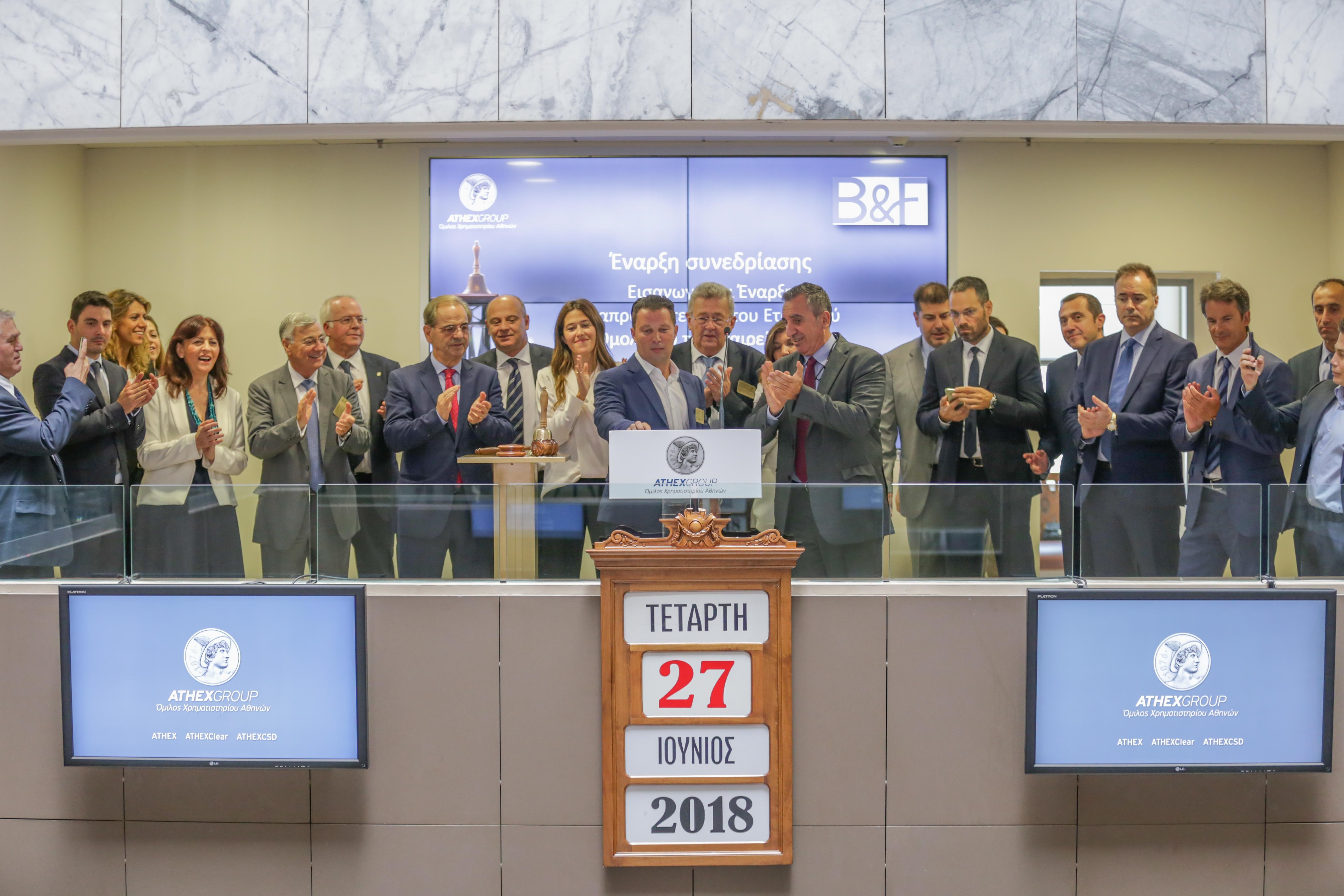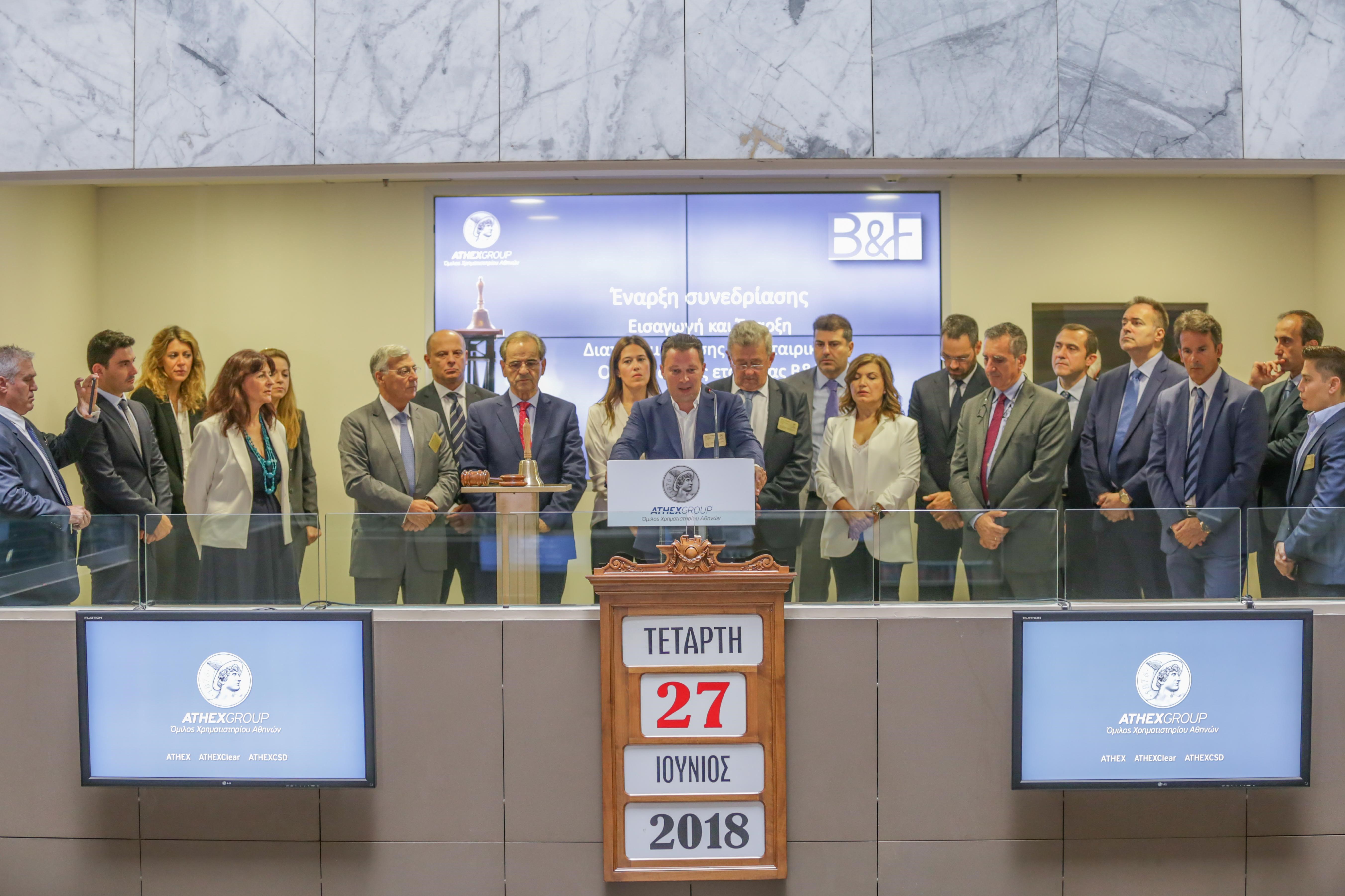 Το Χρηματιστήριο Αθηνών υποδέχθηκε σήμερα τον Όμιλο Εταιρειών B&F, στο πλαίσιο της εισαγωγής και έναρξης διαπραγμάτευσης στην Οργανωμένη Αγορά του Χρηματιστηρίου Αθηνών του εταιρικού του ομολόγου.