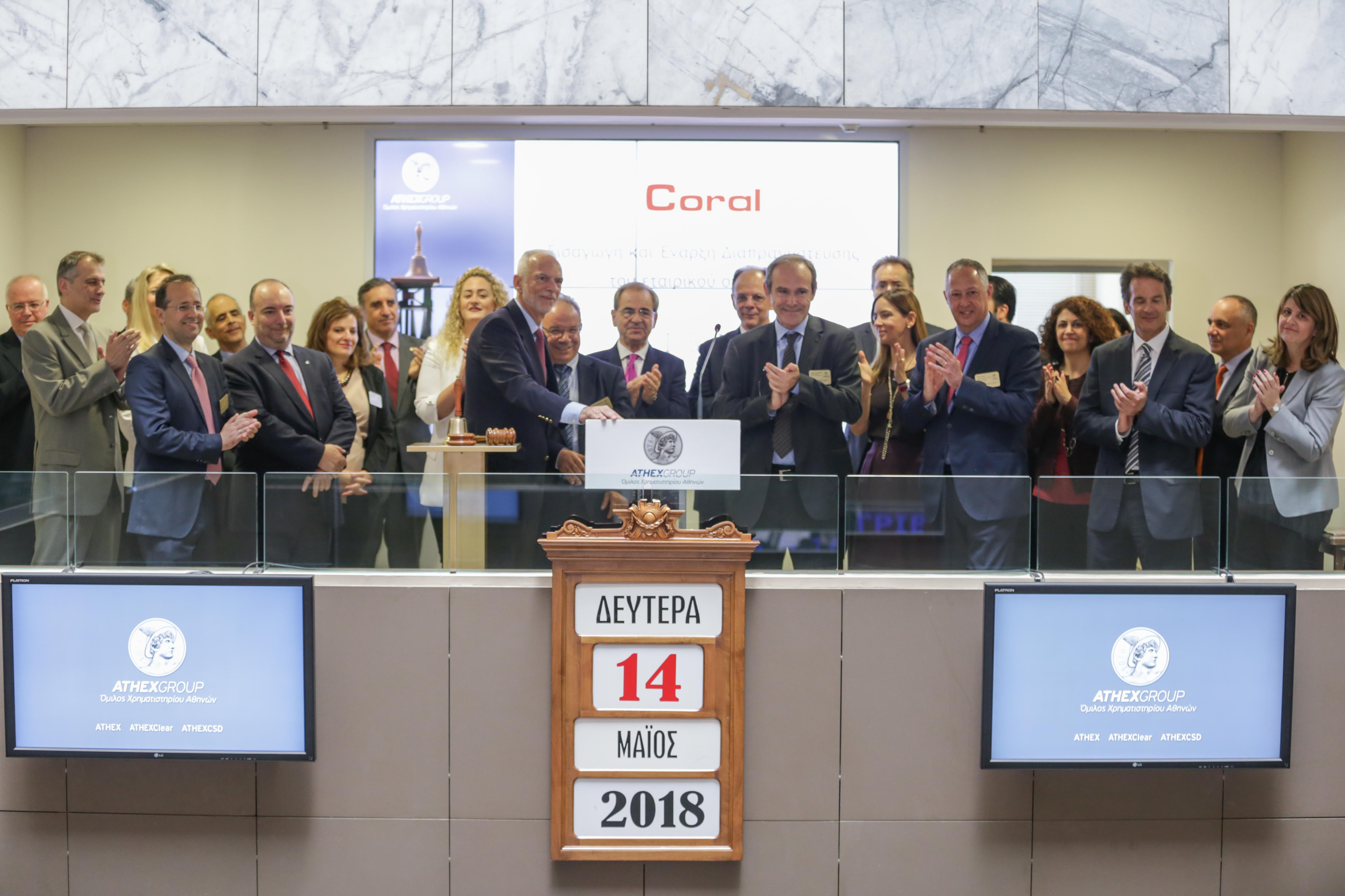 Το Χρηματιστήριο Αθηνών υποδέχθηκε σήμερα την εταιρεία Coral, στο πλαίσιο της εισαγωγής και έναρξης διαπραγμάτευσης στην Οργανωμένη Αγορά του Χρηματιστηρίου Αθηνών του εταιρικού της ομολόγου. Συνολικά διατέθηκαν 90.000 κοινές ανώνυμες ομολογίες της Εταιρείας με ονομαστική αξία 1.000 ευρώ, με συνέπεια την άντληση κεφαλαίων ύψους 90.000.000 εκ. ευρώ με επιτόκιο 3,00%.