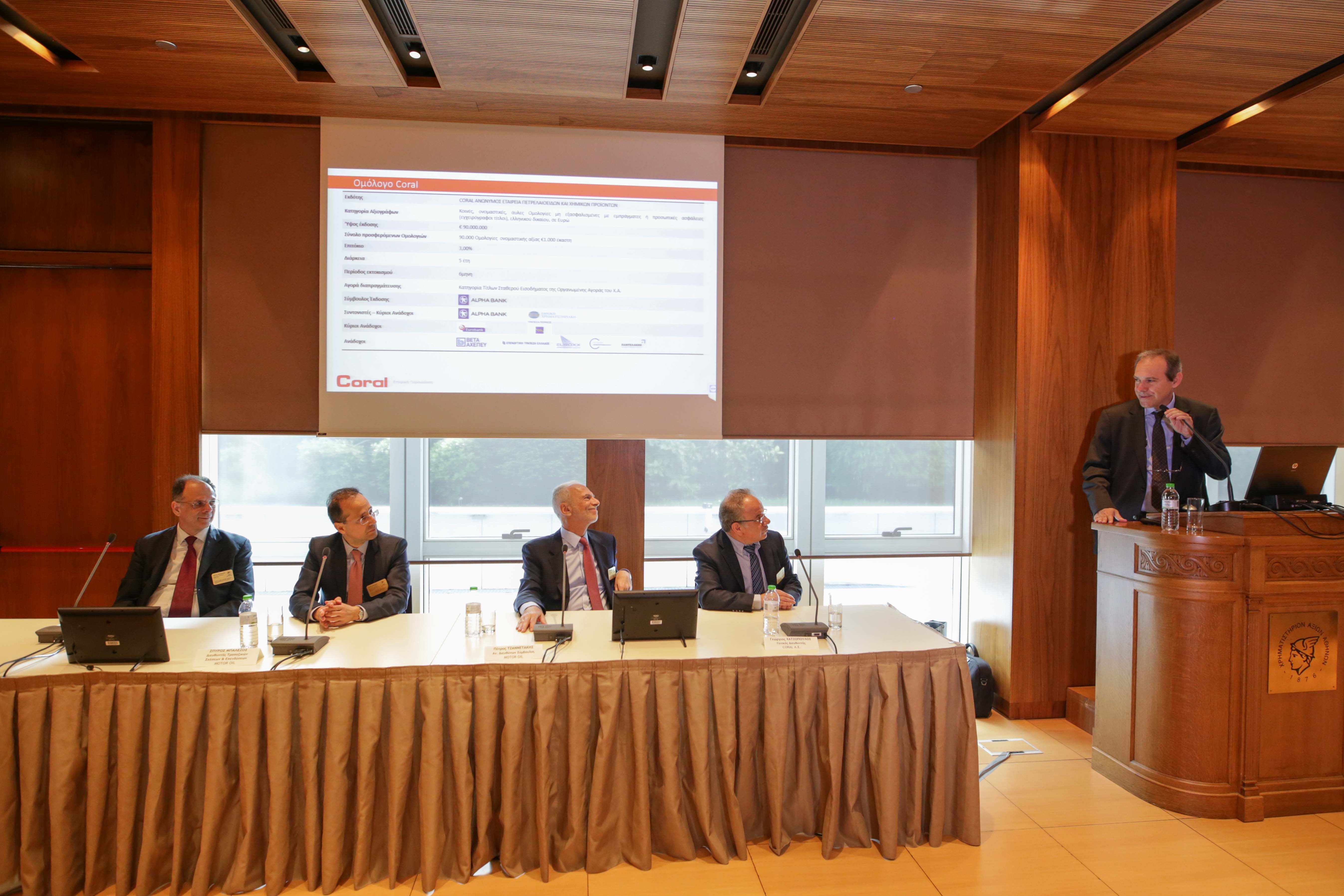 Κατά τη διάρκεια της τελετής έναρξης της συνεδρίασης ο Αναπληρωτής Διευθύνων Σύμβουλος της MOTOR OIL κ. Πέτρος Τζαννετάκης αφού ευχαρίστησε όλους τους συμμετέχοντες στο έργο έκδοσης του ομολόγου δήλωσε: «Η επιτυχημένη έκδοση των ομολογιών της CORAL A.E. επιβεβαιώνει την εμπιστοσύνη του επενδυτικού κοινού στον Όμιλο ΜΟΤΟΡ ΟΙΛ ο οποίος ξεκίνησε το δικό του οδοιπορικό στο Χρηματιστήριο Αθηνών το 2001. Η εισαγωγή και διαπραγμάτευση των ομολογιών της CORAL στην αγορά του Χρηματιστηρίου ενισχύει την ήδη υψηλή αναγνωρισιμότητα της Εταιρίας και σηματοδοτεί την εδραίωση των πρακτικών εταιρικής διακυβέρνησης με τρόπο που διασφαλίζεται διαχρονικά. Ουσιαστικά, η λειτουργία της μεγαλύτερης θυγατρικής της ΜΟΤΟΡ ΟΙΛ αντικειμενικοποιείται μέσω του Χρηματιστηρίου Αθηνών».
