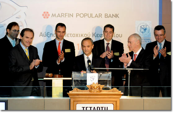 Με την ευκαιρία της εισαγωγής των νέων μετοχών, πραγματοποιήθηκε πανηγυρική εκδήλωση, κατά τη διάρκεια της οποίας, ο Διευθύνων Σύμβουλος της Marfin Popular Bank κ. Ευθύμιος Μπουλούτας, κήρυξε την έναρξη της διαπραγμάτευσης, σηματοδοτώντας έτσι τη ιδιαίτερη σημασία τόσο της επιτυχημένης Αύξησης Μετοχικού Κεφαλαίου όσο και της δυνατότητας άντλησης κεφαλαίων από το Χρηματιστήριο Αθηνών.