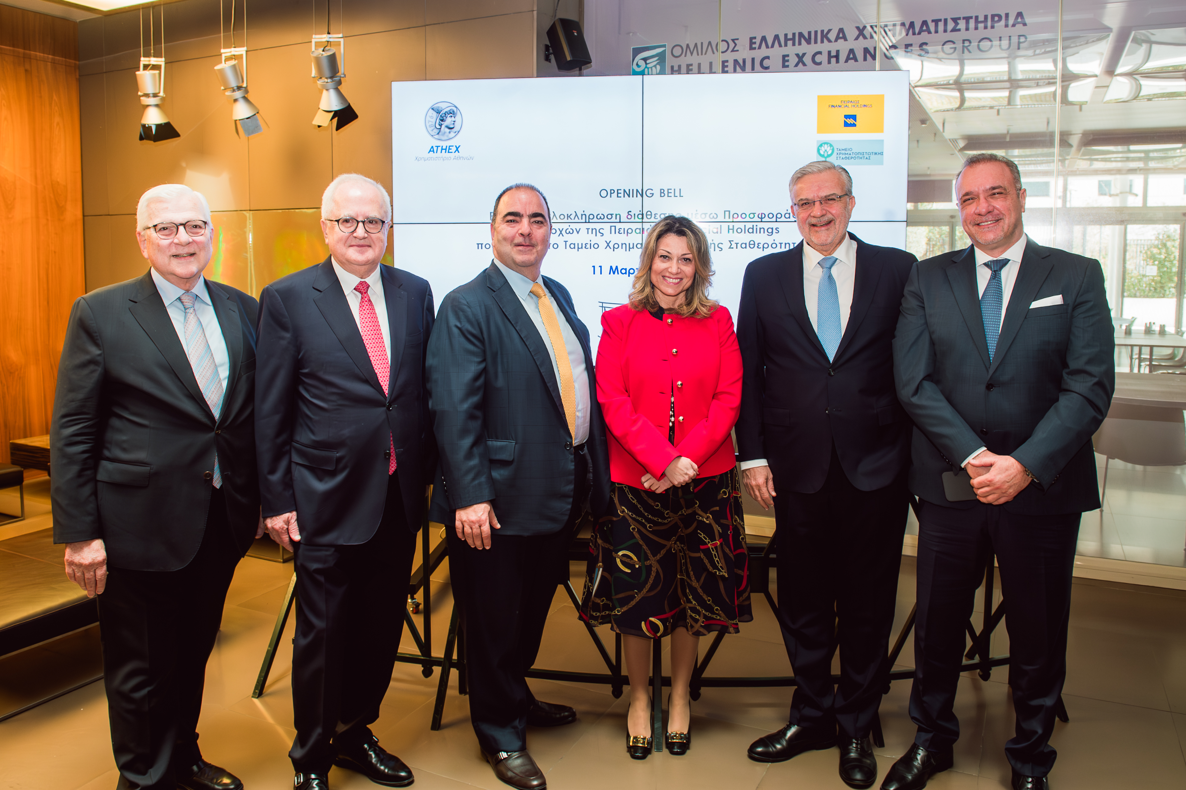 Το Χρηματιστήριο Αθηνών υποδέχθηκε σήμερα εκπροσώπους της Διοίκησης της Πειραιώς Financial Holdings του Ταμείου Χρηματοπιστωτικής Σταθερότητας και των αναδόχων τους, στην πανηγυρική τελετή έναρξης της συνεδρίασης που πραγματοποιήθηκε στο πλαίσιο της επιτυχούς ολοκλήρωσης διάθεσης μέσω Προσφοράς των τίτλων της Πειραιώς Financial Holdings AE που κατείχε το Ταμείο Χρηματοπιστωτικής Σταθερότητας (ΤΧΣ).