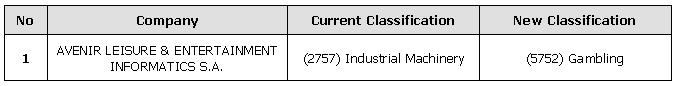 The Athens Exchange announces the following changes in the classification of listed companies according to FTSE/Dow Jones Industry Classification Benchmark (ICB) which will be effective on Monday, December 20, 2010.