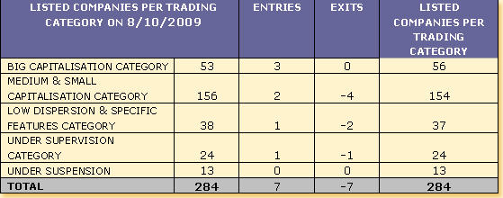 The Board of Directors of the Athens Exchange met on October 8, 2009 and examined the prerequisites, as provided for in the ATHEX Rulebook, regarding the classification of the listed companies in Trading Categories in the regular semi-annual review.