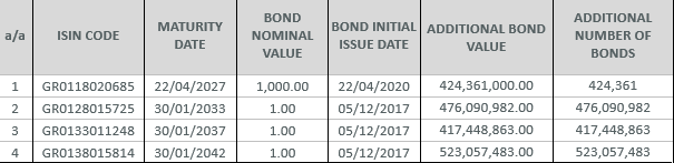 - Listing of additional number of bonds of the Hellenic Republic to the below listed Greek Government Bonds, following the completion of the Exchange Offer with bonds of the 20 Greek Government Bonds issued during the PSI: